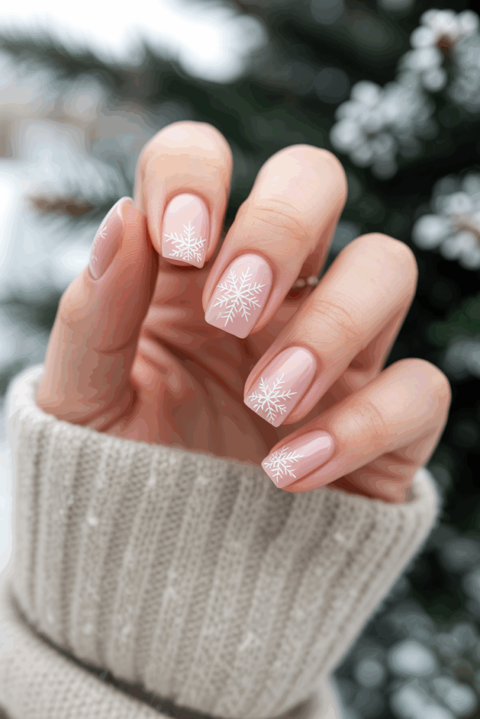 This design uses a soft light pink base to create a calm, winter feel. White snowflakes add a delicate and seasonal touch. The nails look elegant and simple, perfect for everyday wear during the winter months.