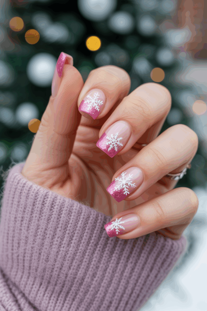 This style features pink nails with glittery tips that add shine and sparkle. Delicate snowflake patterns on the tips bring a winter feel without being too bold. It works well for both casual and festive occasions.
