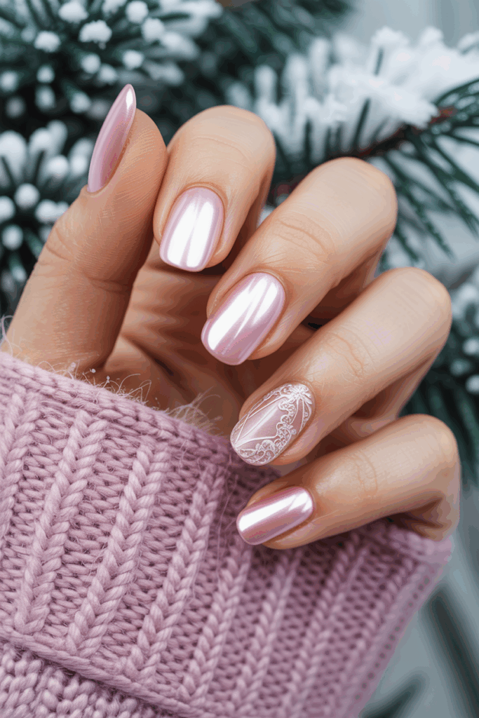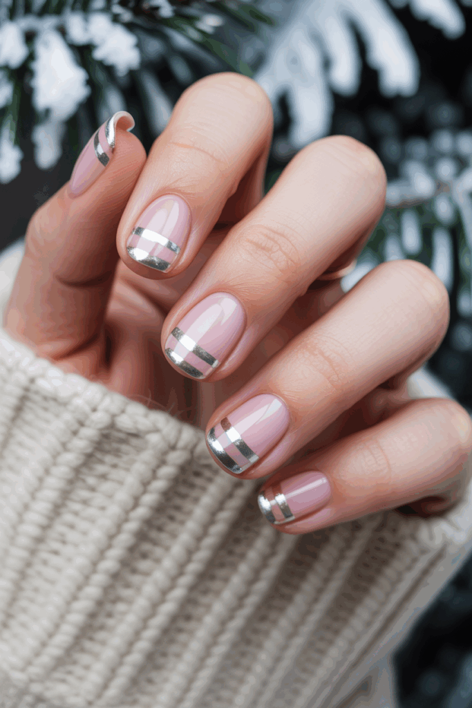 This design combines soft pink with sharp silver stripes. The pink base adds a cool, icy feel. Silver stripes create a clean, modern look. It works well for winter, balancing subtle color with a touch of shine. This style suits both casual and festive occasions.