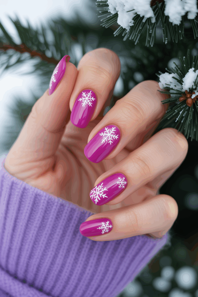 Magenta pink nails offer a bold but stylish winter look. Snowflake decals add a delicate, seasonal touch. This combination balances bright color with festive detail. It works well on any nail shape, making it a versatile choice for winter.