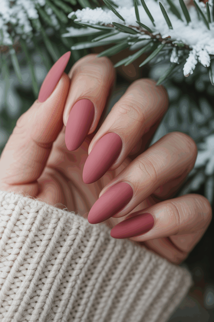 Matte dusty rose nails in an almond shape offer a soft and elegant look. This style is subtle yet stylish, fitting well with winter’s muted tones. The matte finish keeps the color smooth and understated, perfect for both everyday wear and special occasions.