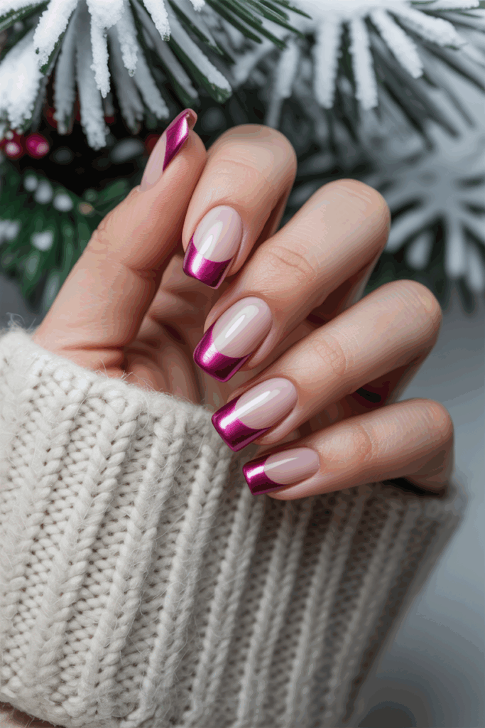 Metallic magenta French tips add a bold and shiny look to winter nails. The bright color stands out while still feeling elegant. This style works well for anyone wanting a simple, yet eye-catching manicure. It pairs nicely with darker or neutral nail bases for contrast.