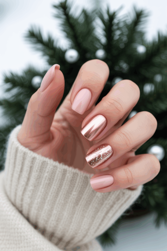 The rose gold pink accent nail adds a subtle shine to winter manicures. It pairs well with soft pink shades to create a warm, elegant look.