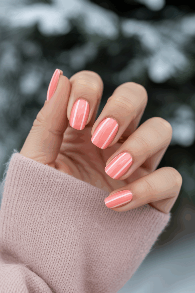This design combines soft coral pink nails with simple white stripes. The stripes add a clean, modern touch to the warm coral shade.