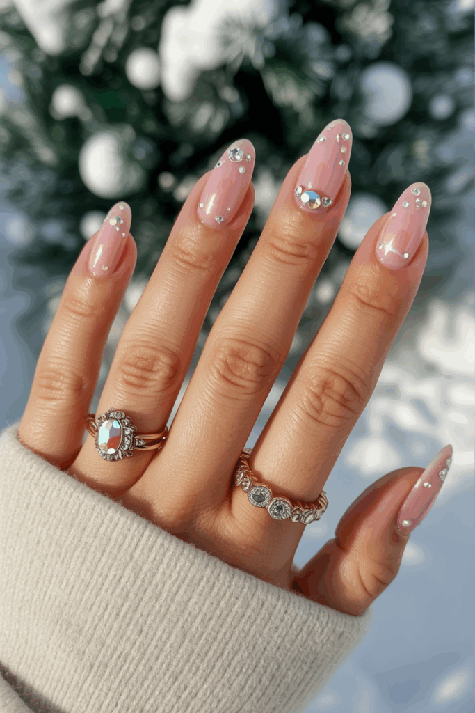 This design features soft pastel pink almond-shaped nails. Small, delicate dots in light colors add a playful yet simple detail. The look is subtle and perfect for winter, offering a gentle twist on classic pink nails.