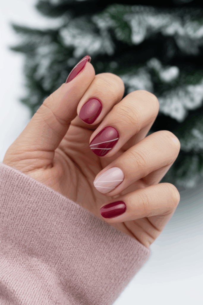 This design uses a soft velvet pink base that feels warm and cozy. Thin, simple lines add a clean, modern touch without overwhelming the look. It is perfect for those who want elegance with a subtle edge this winter.