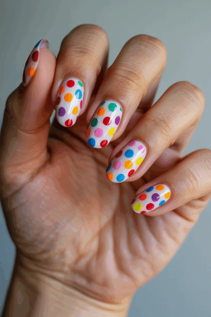 Multi-colored polka dot nails use different colors for each dot, creating a lively and playful look. This style works well with both bright and pastel shades, offering variety for different moods and seasons.