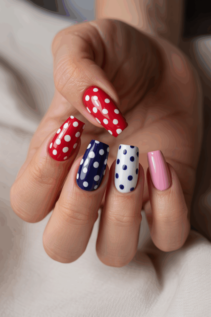 This style blends different polka dot patterns on each nail. One nail may have large dots, while another features tiny ones.