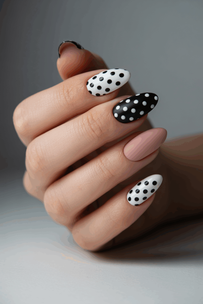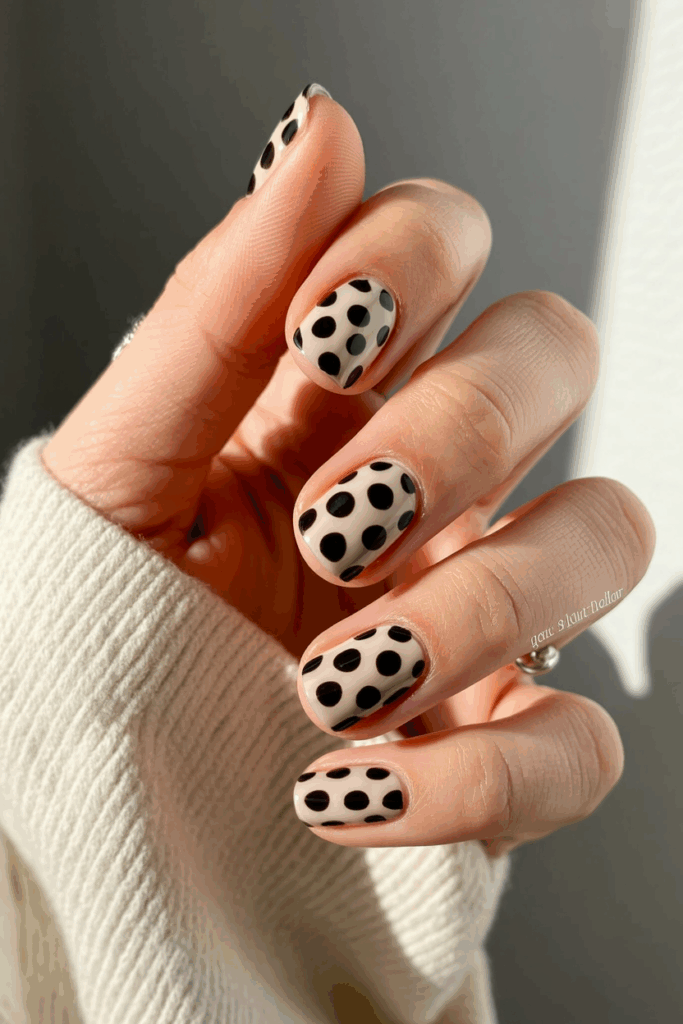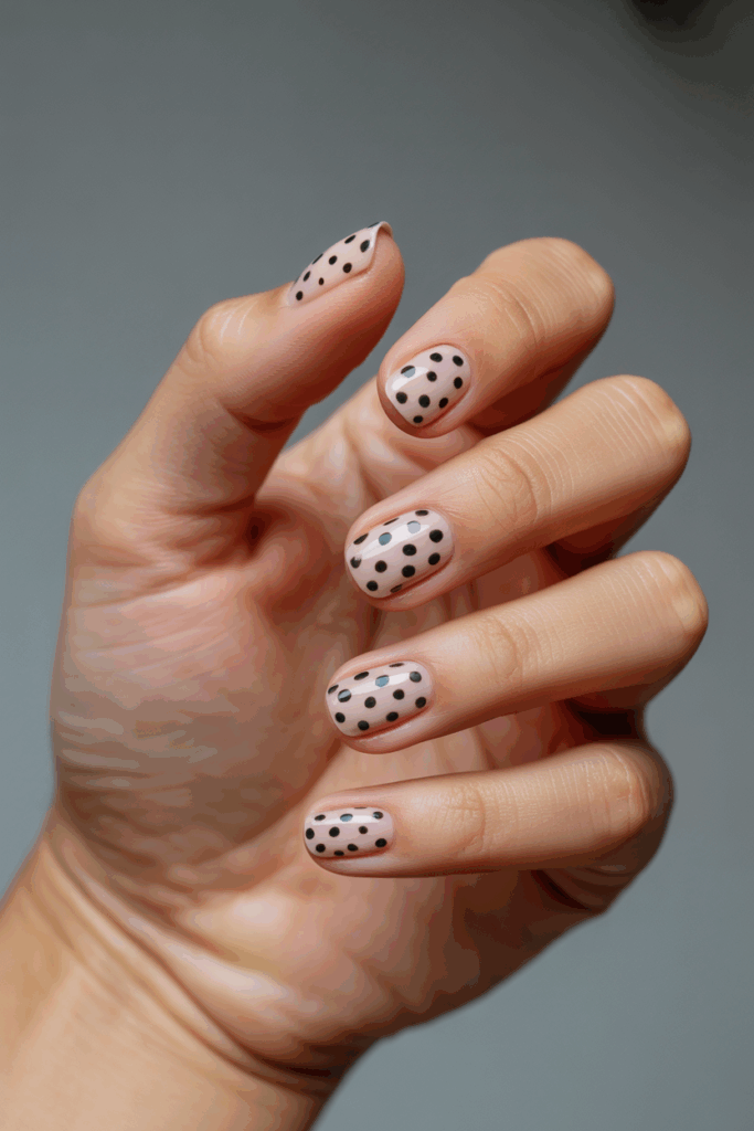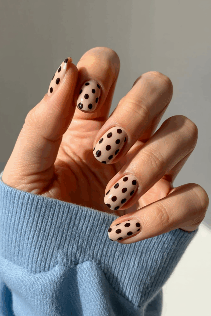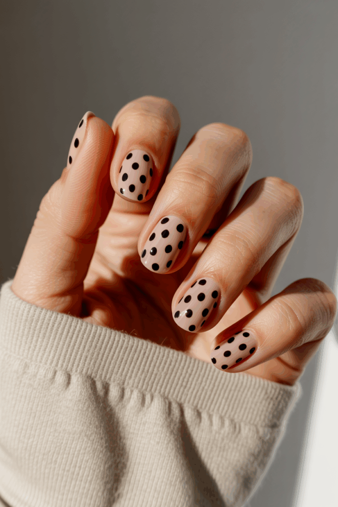 This design pairs black polka dots with a soft nude base. It creates a clean and simple look that still stands out.