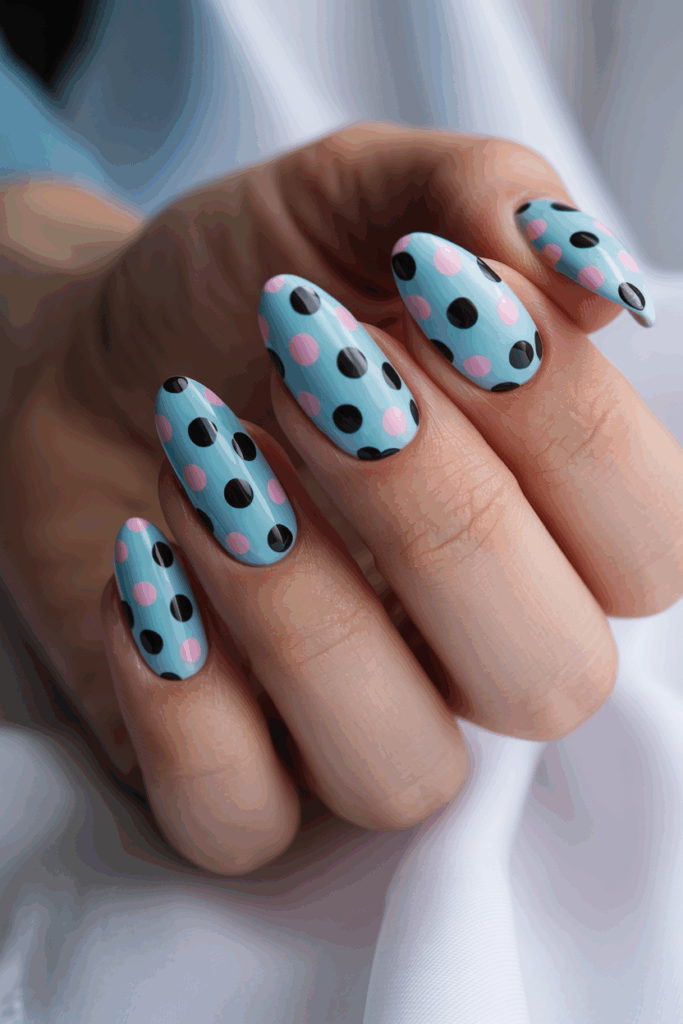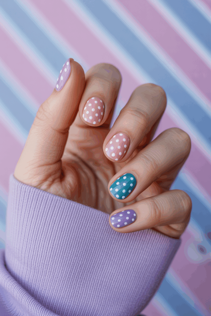 Pastel polka dot nails offer a soft and fresh look. Light colors like baby blue, pale pink, and lavender create a gentle base.