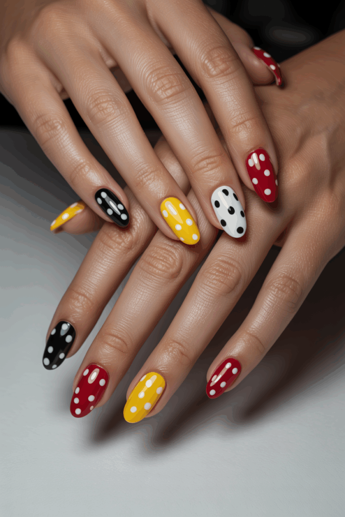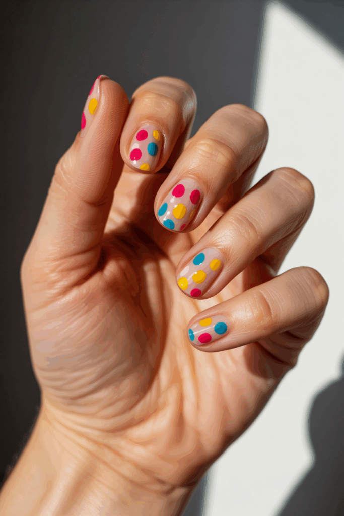 Bright colored polka dots add energy and fun to any nail design. They often use vibrant tones like red, yellow, blue, or green to make the dots stand out.