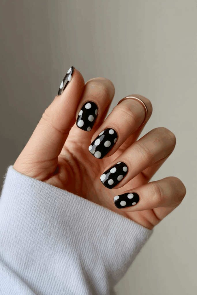 This style uses strong colors like black and white to create a clear, striking look. The sharp contrast makes each dot stand out, drawing attention to the nails.