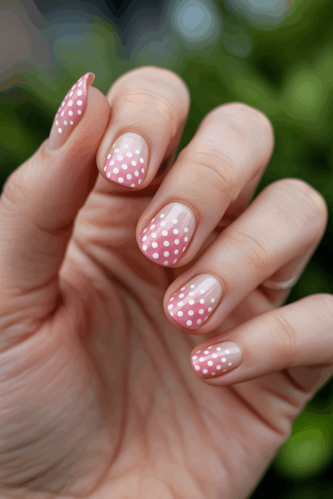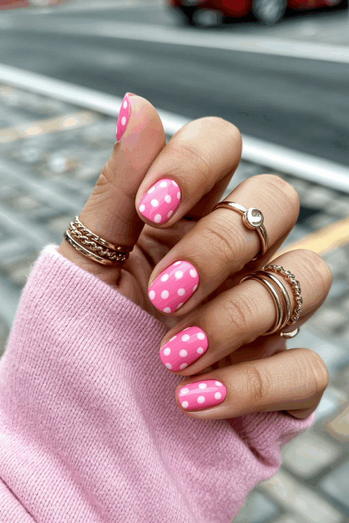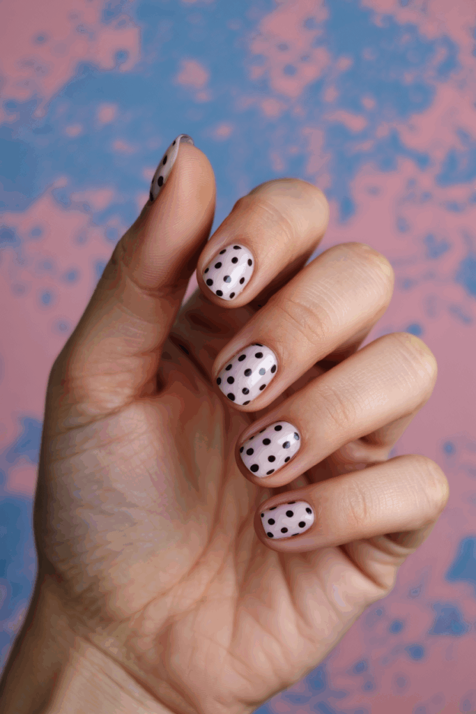 This style can range from light, pastel pinks with white dots to bold pink bases with black dots. It works well on both short and long nails, making it a versatile choice for many.