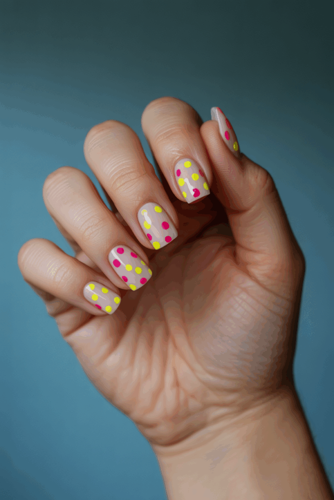 Neon polka dot nails offer a bright and bold look. They mix classic dots with vivid neon colors for a fresh twist.