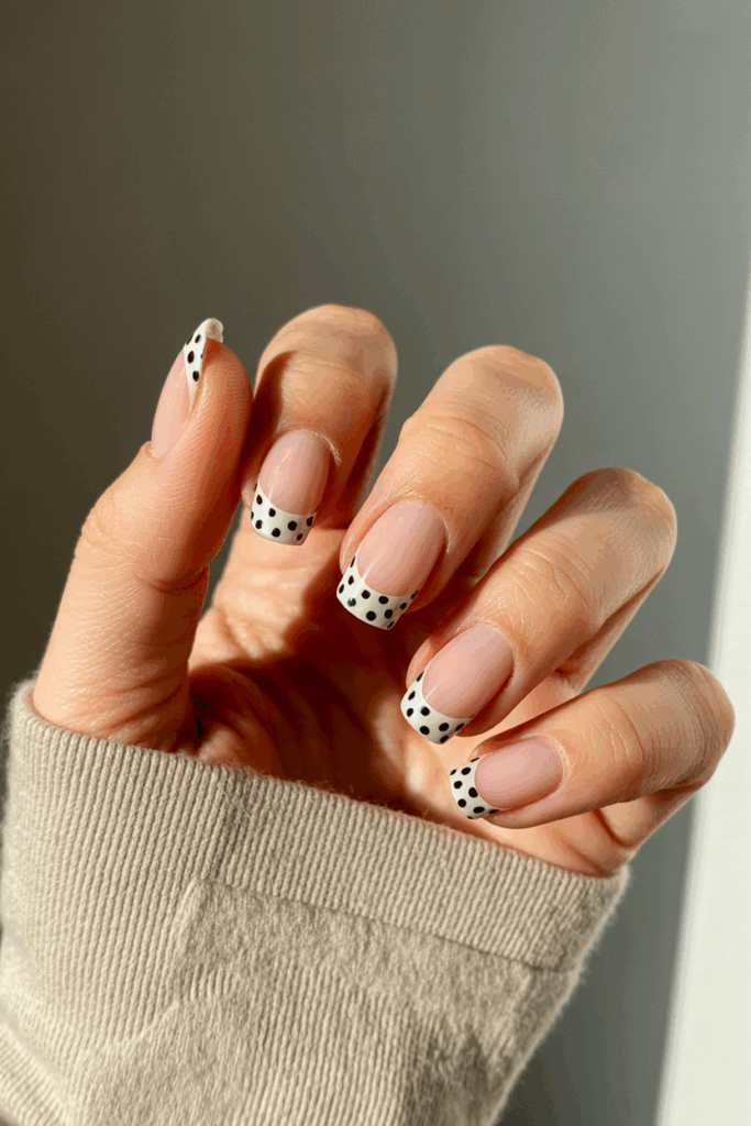 Polka dot French tips add a playful twist to the classic manicure. They often feature tiny dots along the tip line, creating a subtle, fun pattern.