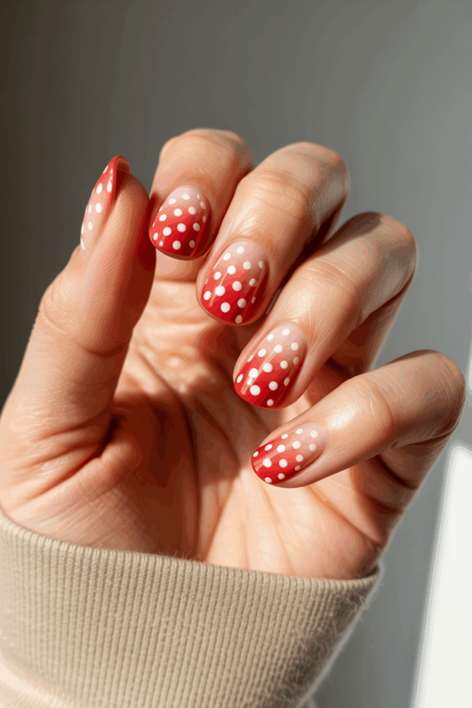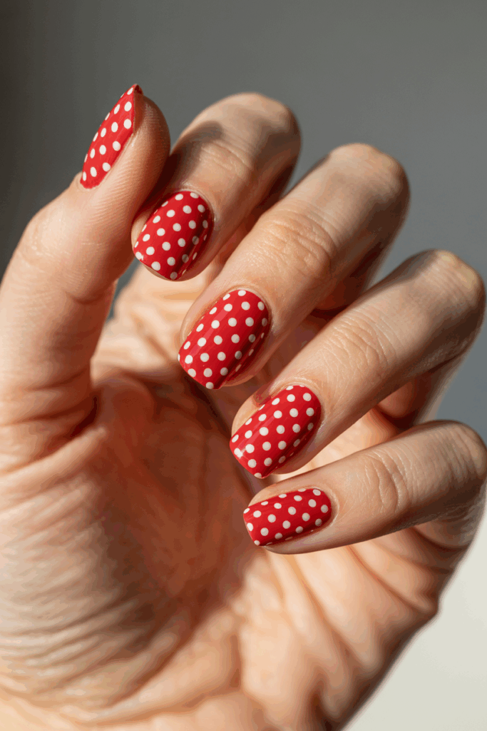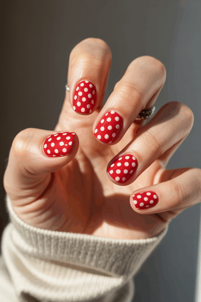Red and white polka dot nails offer a classic and playful look. The contrast between the bold red and clean white creates a fresh, eye-catching style.