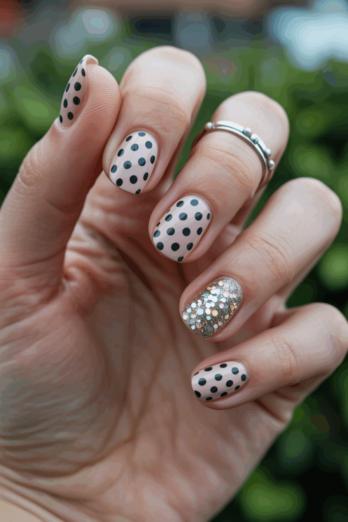 This style combines classic polka dots with a touch of sparkle. Typically, one or two nails feature glitter while the rest showcase simple dots.