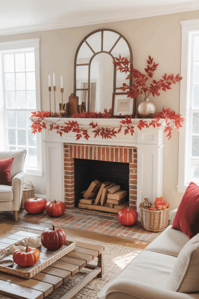 This living room perfectly captures the warmth of autumn with its rich pops of red. Deep crimson throw pillows, a gingham accent, and a bold red ottoman instantly draw the eye and create a welcoming, seasonal feel. Paired with neutral seating and a rustic wood coffee table, the red accents become the star without overwhelming the space. A mix of pumpkins in vibrant orange tones and lush red foliage in a glass vase ties the entire look together, making this space feel both festive and inviting.
