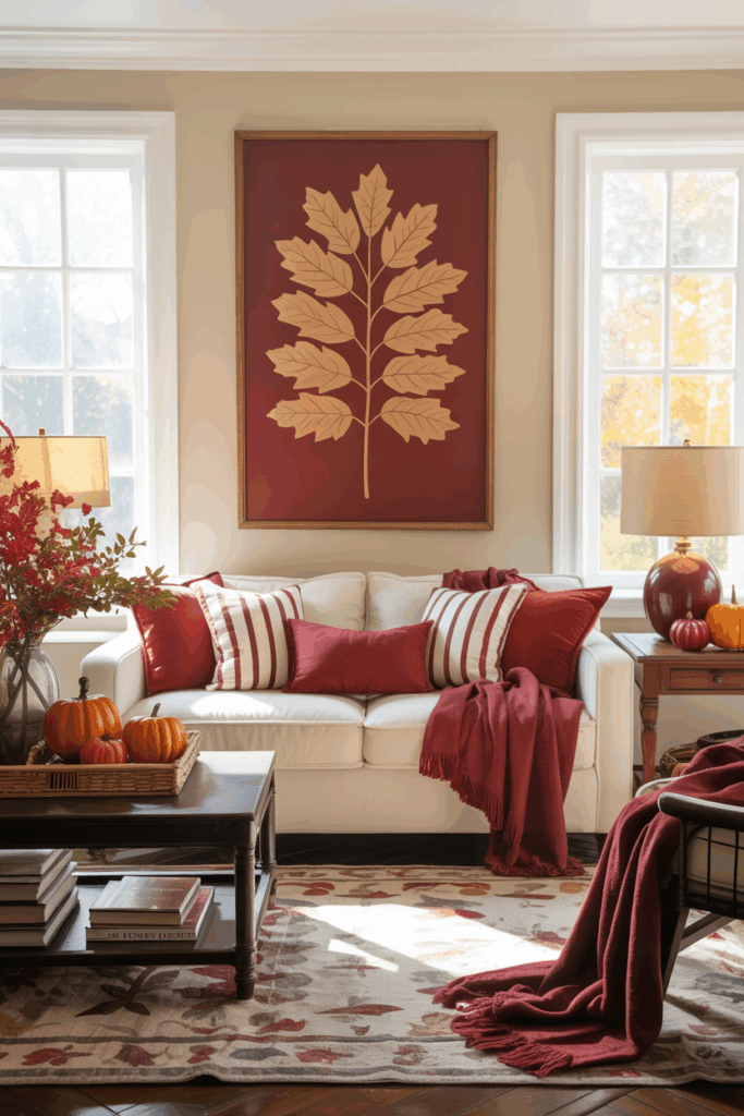 Swap out neutral summer textiles for rich red throw pillows and cozy blankets to instantly shift your space into fall mode. Layer different textures like knit, velvet, and flannel to add depth and visual interest. This small change can make a big impact without requiring a full room makeover.