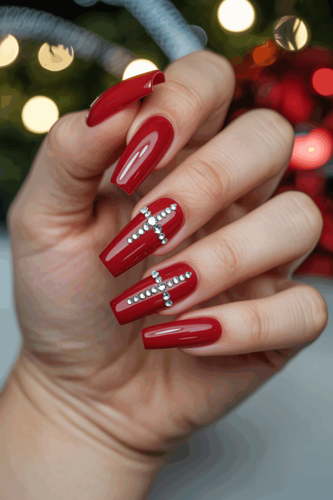 Cherry red nails adorned with rhinestones bring elegance and shine to a vibrant hue. A few carefully placed crystals catch the light just enough to create a dazzling but tasteful effect. This manicure pairs beautifully with holiday dresses or sparkly evening wear. The bright tone feels lively and feminine, ideal for celebrating in style.