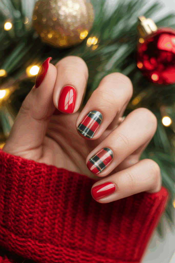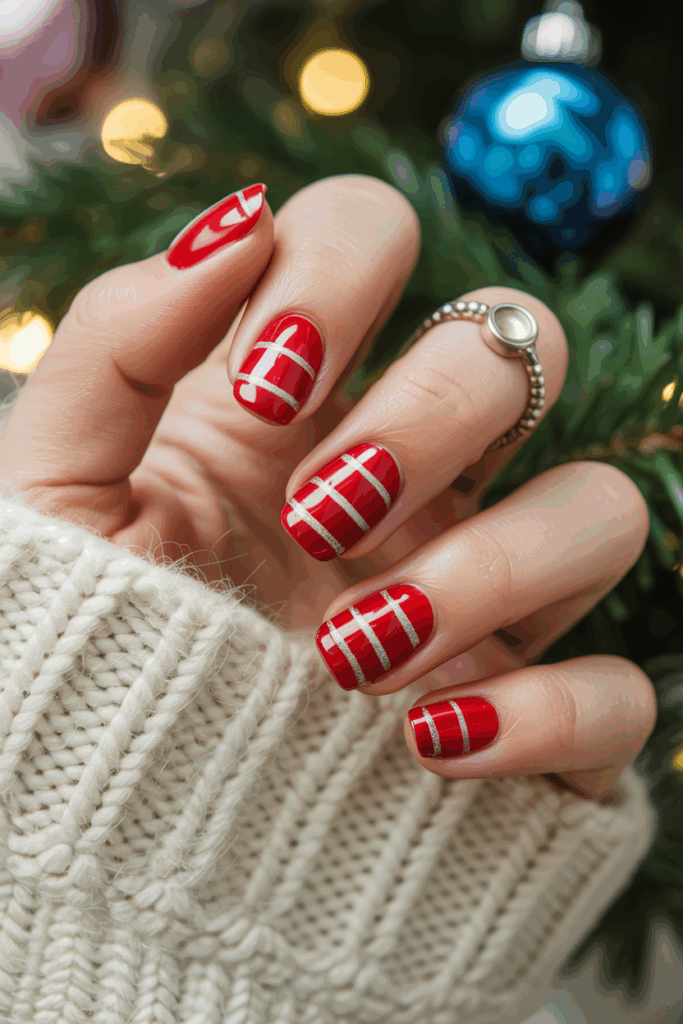 Plaid nails bring warmth and nostalgia to the holiday season. A red base overlaid with thin black, gold, or white stripes creates the familiar flannel-inspired pattern. This design feels both cozy and fashionable—perfect for anyone who loves rustic winter charm. It pairs beautifully with scarves, sweaters, and cocoa by the fire.