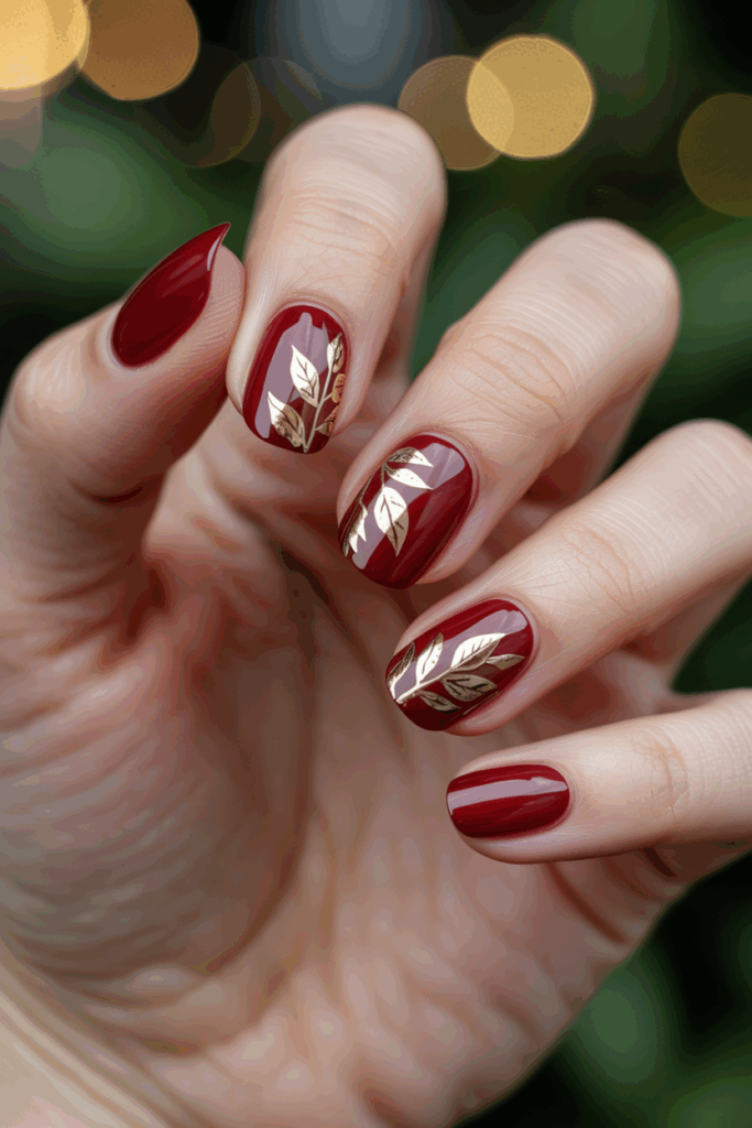 Burgundy nails paired with shimmering gold foil create a look that feels regal and refined. The deep red shade offers richness, while flecks of gold foil catch the light like holiday ornaments. It’s a timeless design that works well for formal occasions or winter weddings—sophisticated, festive, and effortlessly elegant.