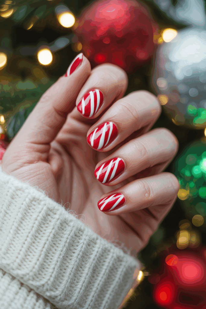 Candy cane stripes are a cheerful and nostalgic design that instantly channels the Christmas spirit. Thin white and red lines swirl across each nail like the classic holiday treat. This playful pattern works well on any nail length and adds a fun, eye-catching touch. For extra sparkle, try a glitter topcoat to make the stripes shimmer under the lights.