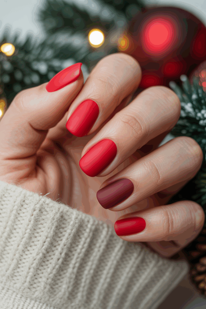 Pairing glossy red nails with matte accent nails creates instant visual interest. The contrast in textures feels contemporary and polished, turning a traditional manicure into something fresh. This subtle mix works for both professional and festive settings, offering just the right amount of sophistication with a twist.