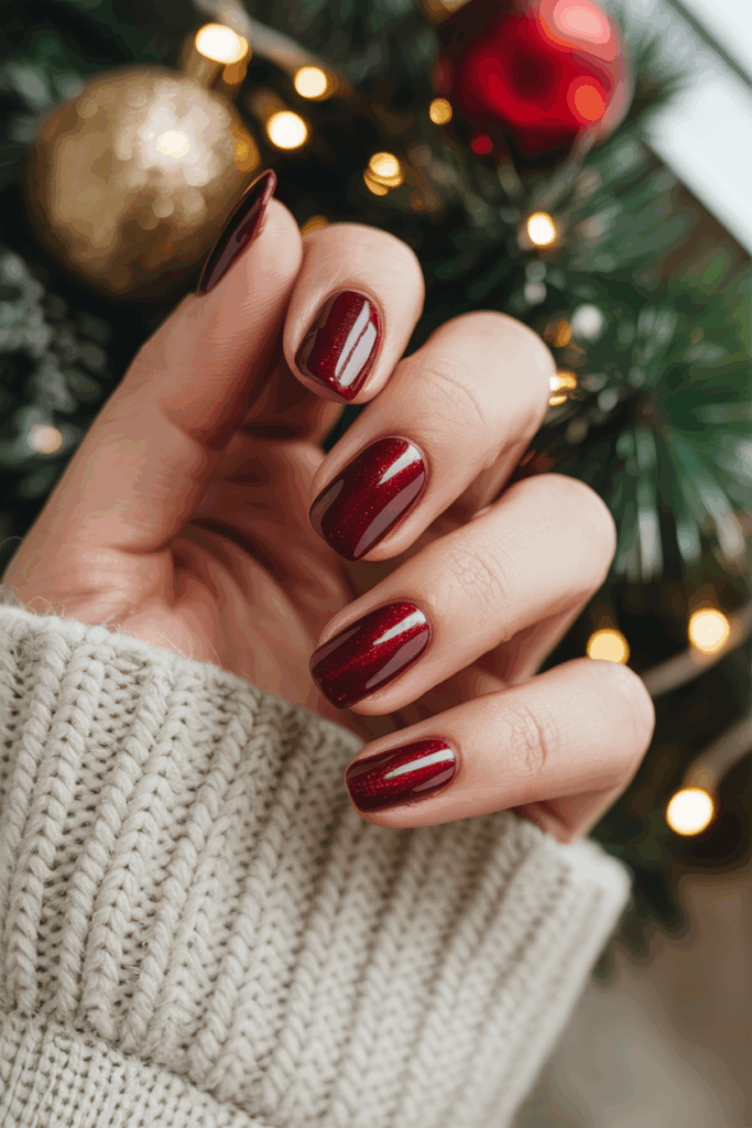 Dark red nails with fine shimmer bring understated luxury to your winter look. The deep tone feels cozy and romantic, while the soft glimmer adds movement and light. This manicure works perfectly for anyone who wants elegance without bold glitter. It’s equally fitting for everyday wear or evening celebrations.