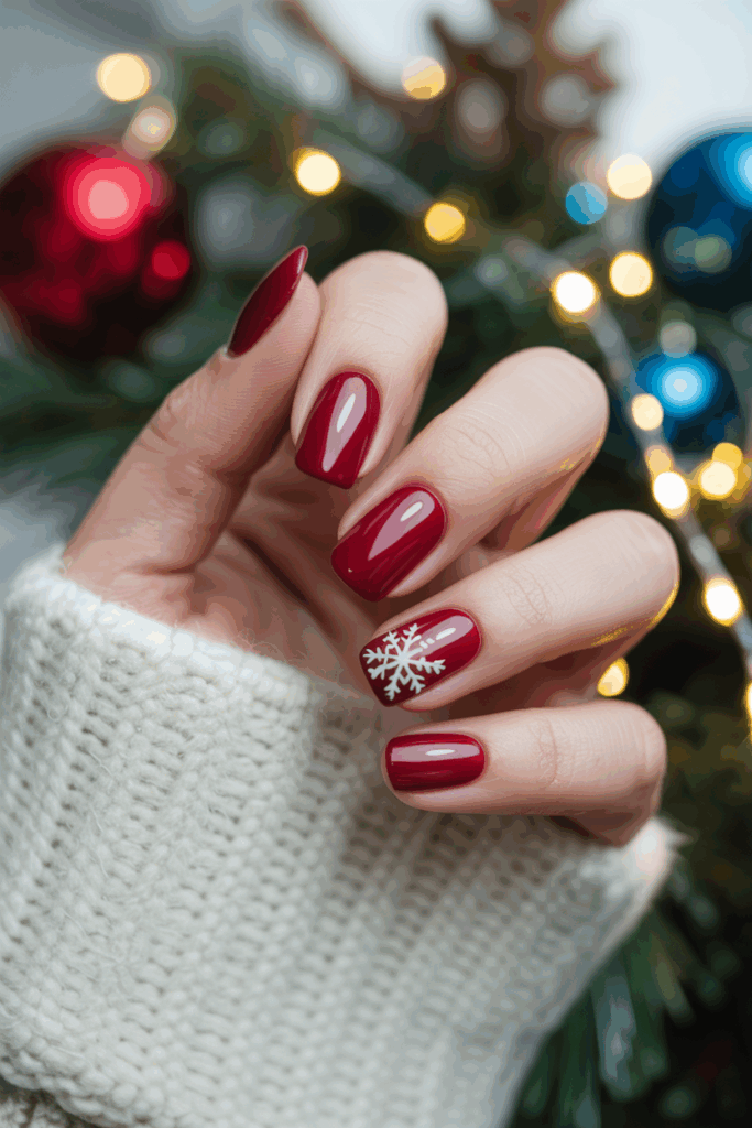 Deep red nails accented with small white snowflakes combine classic color with soft winter imagery. The contrast creates a crisp, frosted effect that’s festive but not flashy. It’s perfect for anyone who wants their nails to reflect the cozy elegance of the season without going over the top.
