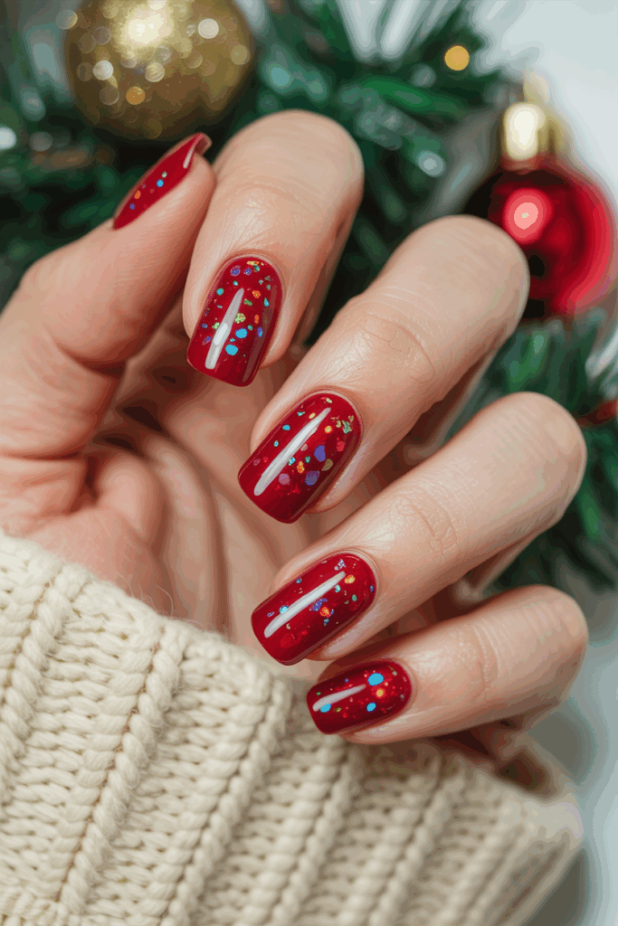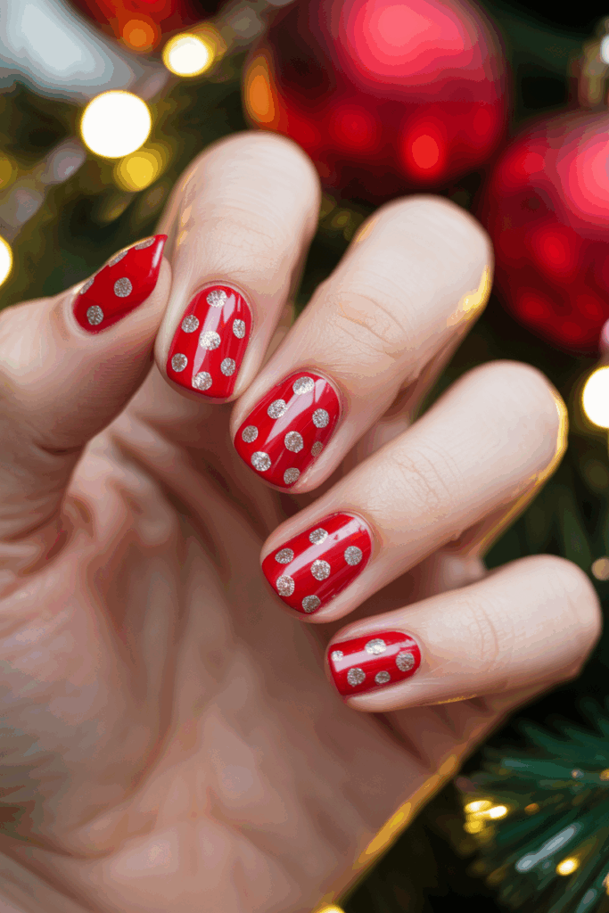 Glittery polka dots on a red base add playful charm to your holiday manicure. The dots bring just enough sparkle to make the nails shine without feeling overdone. This design looks best on shorter nails and adds a lighthearted touch to any outfit. It’s fun, youthful, and easy to recreate at home.