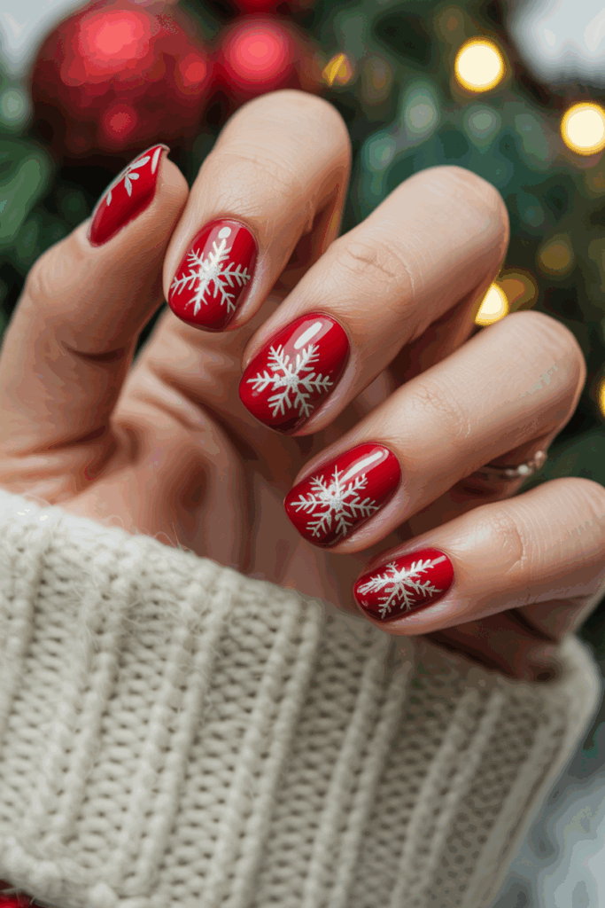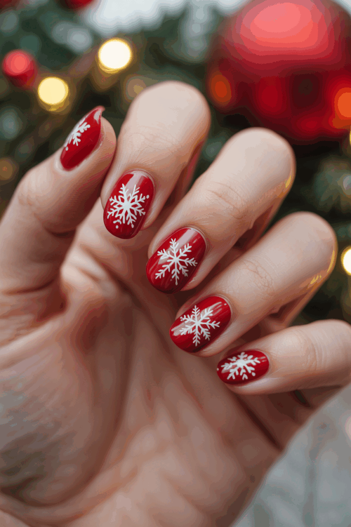 Red nails decorated with delicate white snowflakes create a festive yet refined design. The contrast between the bright red base and soft white accents gives a crisp, wintry look. It’s an easy style to achieve with nail stickers or decals and ideal for spreading subtle holiday cheer without too much sparkle.