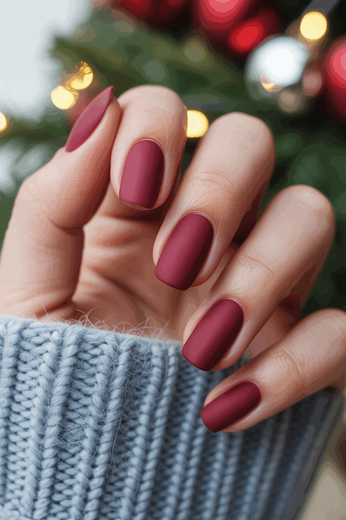 Matte deep crimson nails offer a sophisticated twist on a beloved classic. The velvety finish creates a rich, modern texture while maintaining the warmth of the traditional red tone. It’s understated but powerful, ideal for formal dinners or holiday parties. Add a touch of gold foil or a single rhinestone accent for subtle glamour.