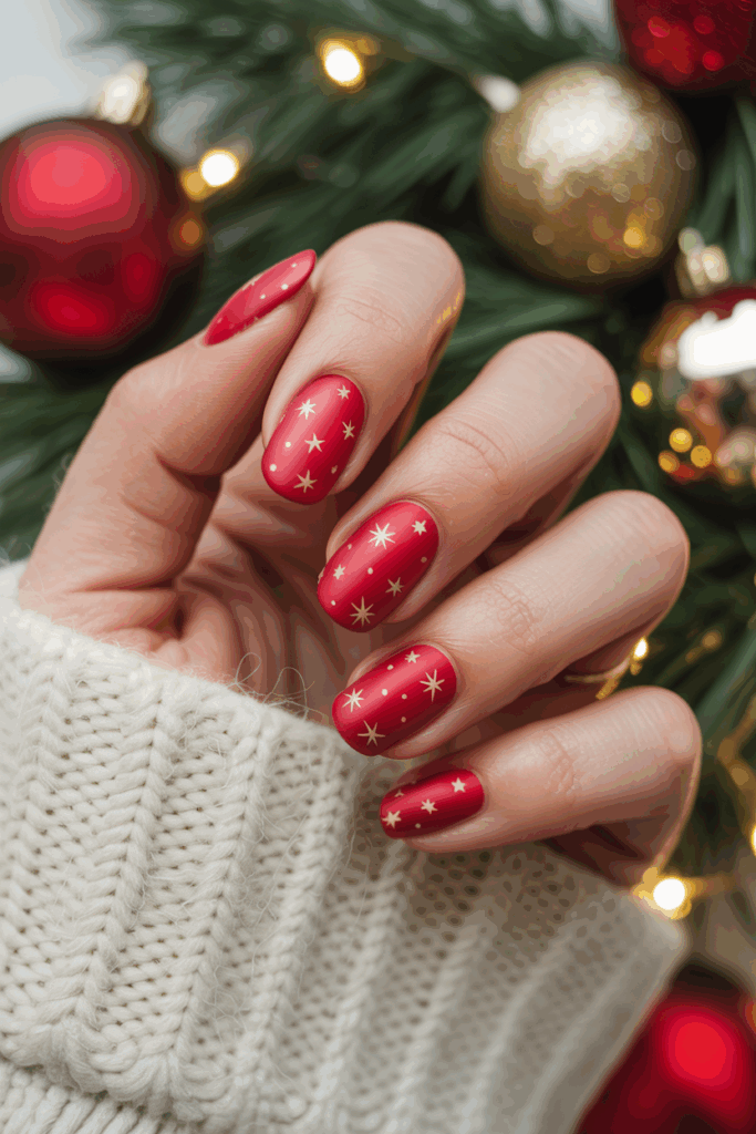 Matte red nails decorated with tiny gold stars bring understated brilliance to your manicure. The matte finish tones down the shine, allowing the gold details to stand out subtly. It’s an elegant mix of warmth and sparkle—perfect for those who want a refined yet festive design. Pair it with gold rings or accessories for a coordinated look that glows softly through the season.