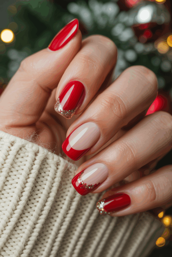 A red French manicure offers a modern, festive update to the classic nude-and-white style. Bold red tips are outlined with a fine line of glitter, giving the nails dimension and holiday sparkle. The look is refined yet fun—perfect for Christmas gatherings or office parties. It’s a small twist that makes a big impression.