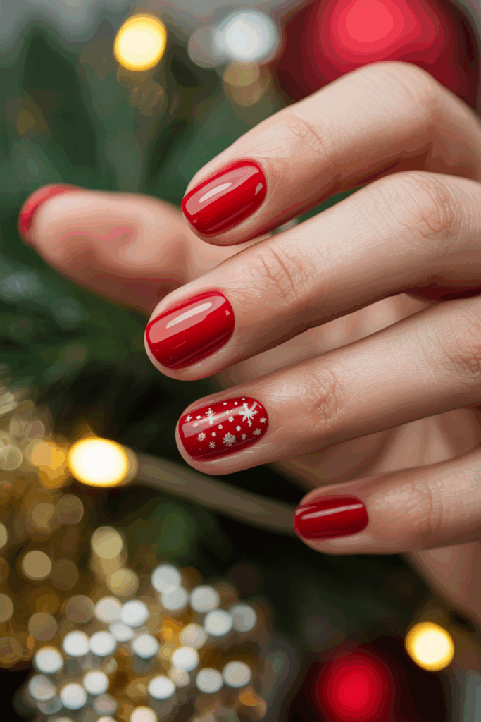 A glossy red base paired with silver snowflakes captures the sparkle of winter nights. The metallic snowflakes shine beautifully under light, adding a touch of seasonal magic. This manicure is easy to personalize—add a single snowflake per nail for simplicity or multiple for a full-on festive look. It’s an elegant, cheerful design that never fails.