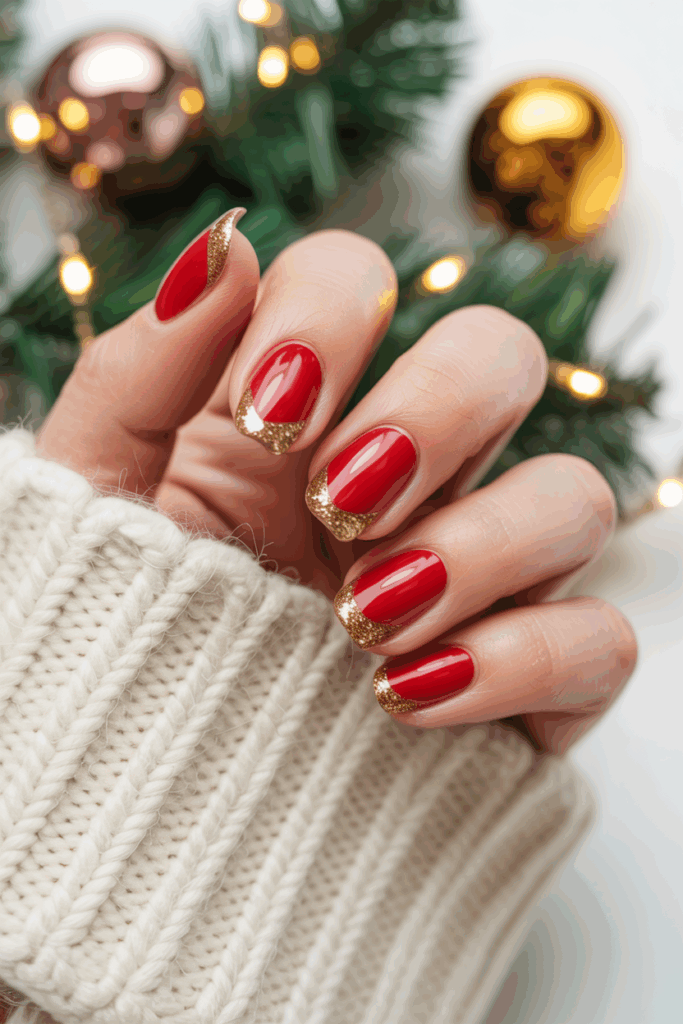 Combining red polish with gold glitter tips creates a glamorous yet balanced manicure. The golden shimmer catches the light beautifully without overwhelming the deep red base. It’s an elegant choice for festive events, effortlessly pairing with metallic accessories or sequined outfits. The result is a design that feels both classic and radiant.
