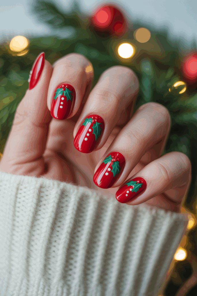 Holly leaf designs on red nails are a charming nod to Christmas tradition. Tiny green leaves and red berry accents pop against the bold red background. The result is cheerful yet tasteful, bringing holiday decor to your fingertips. It’s a perfect match for cozy sweaters and Christmas gatherings.