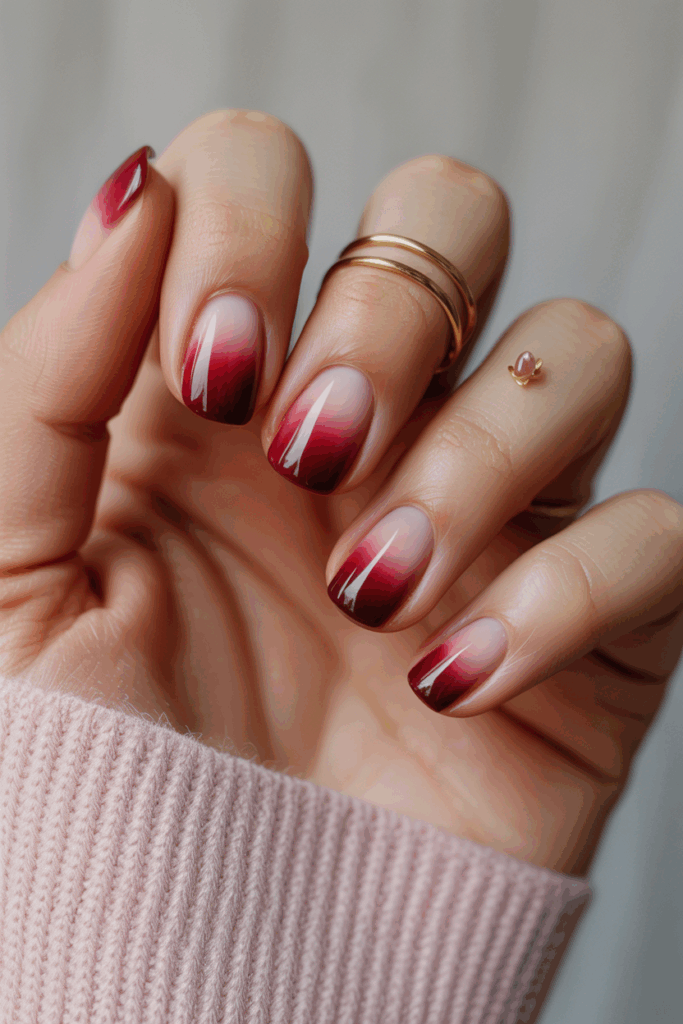 The ombre red gradient blends different shades of red smoothly from light to dark. This style often starts with a soft nude or pale red near the cuticle and fades into a deep, rich red at the tips. It works well on any nail shape or length.