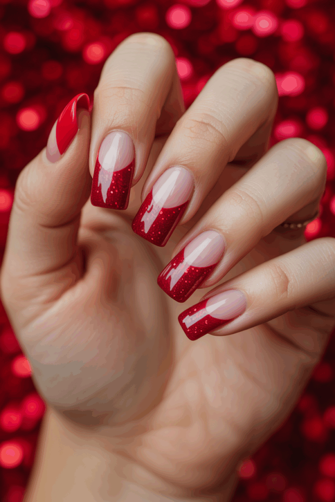 This look combines deep cherry red nails with glitter applied only at the tips. The glitter adds sparkle without overwhelming the bold base color. It works well on both short and long nails.