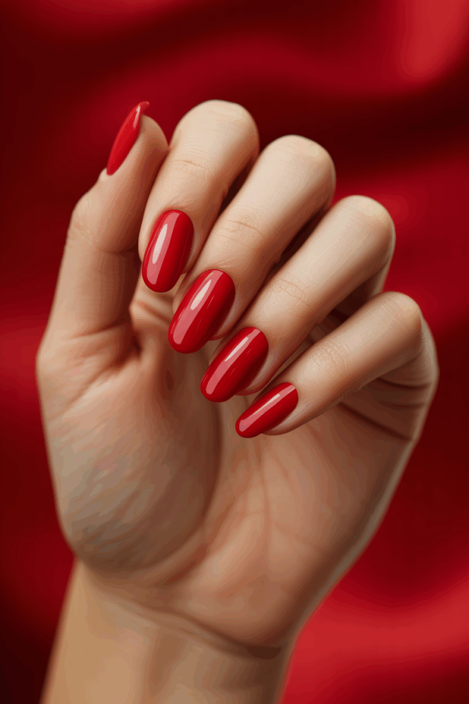 Almond-shaped red nails offer a blend of elegance and boldness. The shape is sleek and elongates the fingers. Red polish in this style adds a classic yet striking look suitable for many occasions.