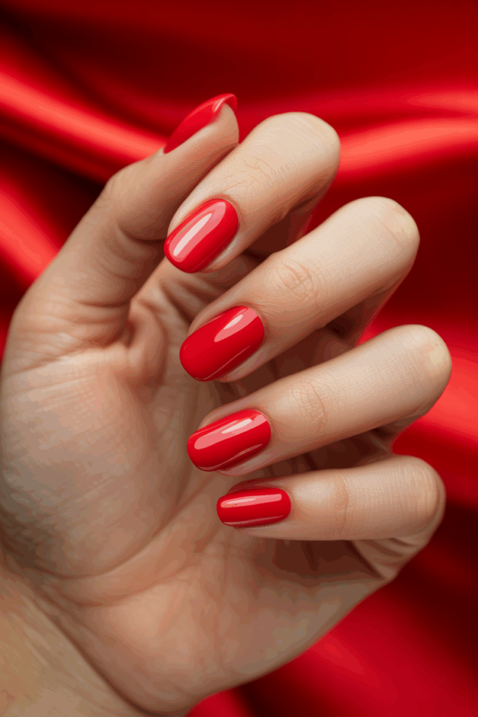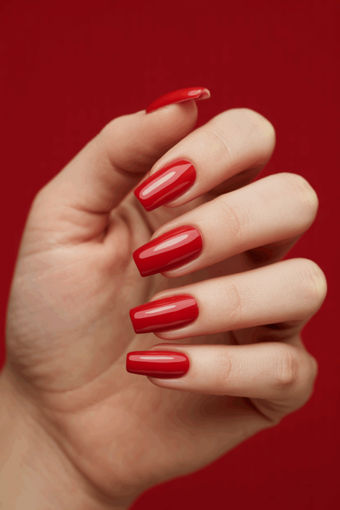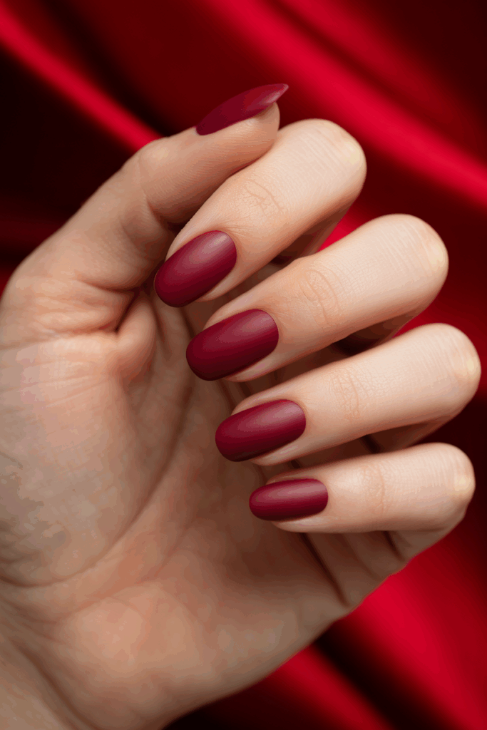Matte texture softens the bold red, giving nails a modern and elegant feel.
