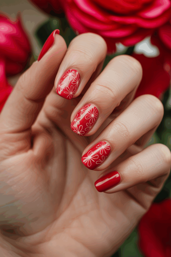 This design pairs deep red nails with small, delicate floral details. The patterns often appear in soft colors like white or nude. It adds a gentle, elegant touch without overwhelming the look. Many choose this style for its balance of bold color and refined art.