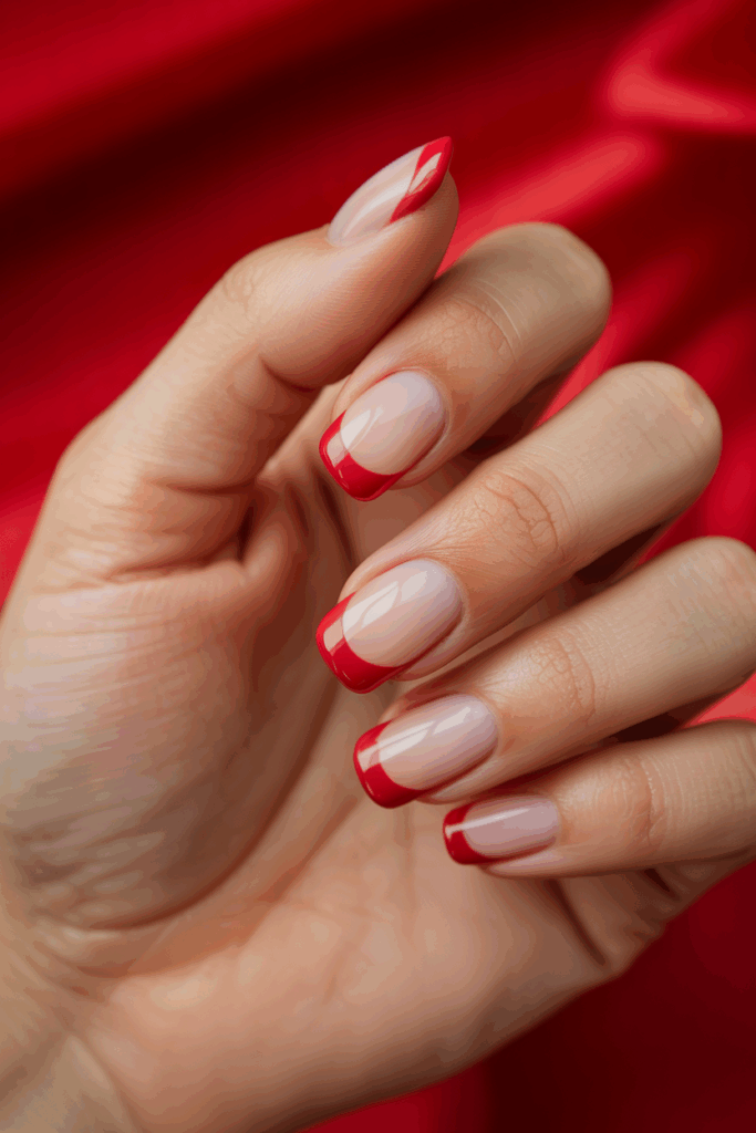 The red French tip is a modern twist on a classic look. It pairs a clean base with bold red tips for a simple yet striking style. This design works well for both casual and formal settings. It can be customized with matte finishes or subtle glitter for extra flair.