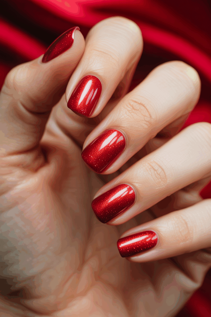 Red nails with holographic shimmer add a subtle shine that changes with light. This style blends classic red with a modern twist. It works well for both casual and formal looks. The shimmer creates a delicate, eye-catching effect without being over the top.