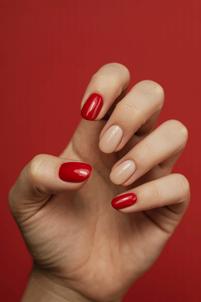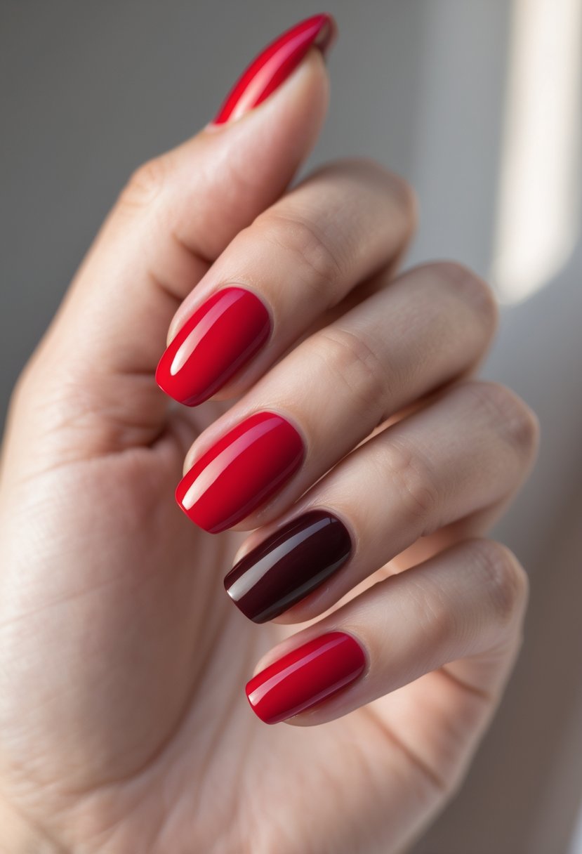 This style blends matte and glossy finishes on red nails. The contrast highlights different textures without adding complexity. It offers a modern twist on classic red nails.