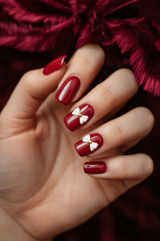 Red nails paired with coquette bows create a blend of classic and playful style. The bow accents add a delicate, feminine touch to the bold red base.