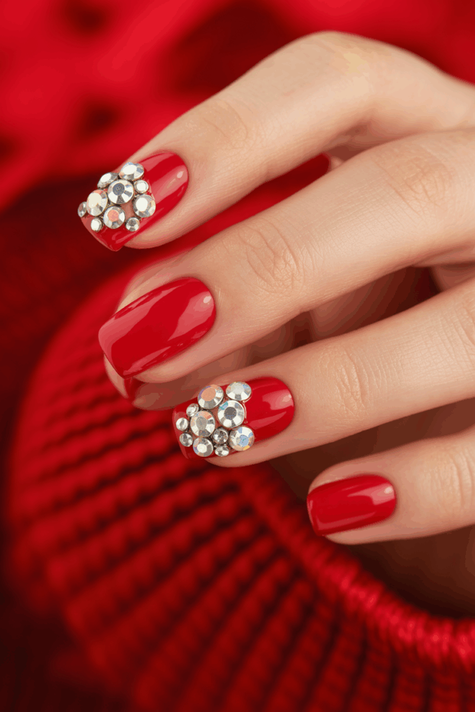 This design features bold red nails with small clusters of rhinestones. The rhinestones add sparkle without overpowering the color.