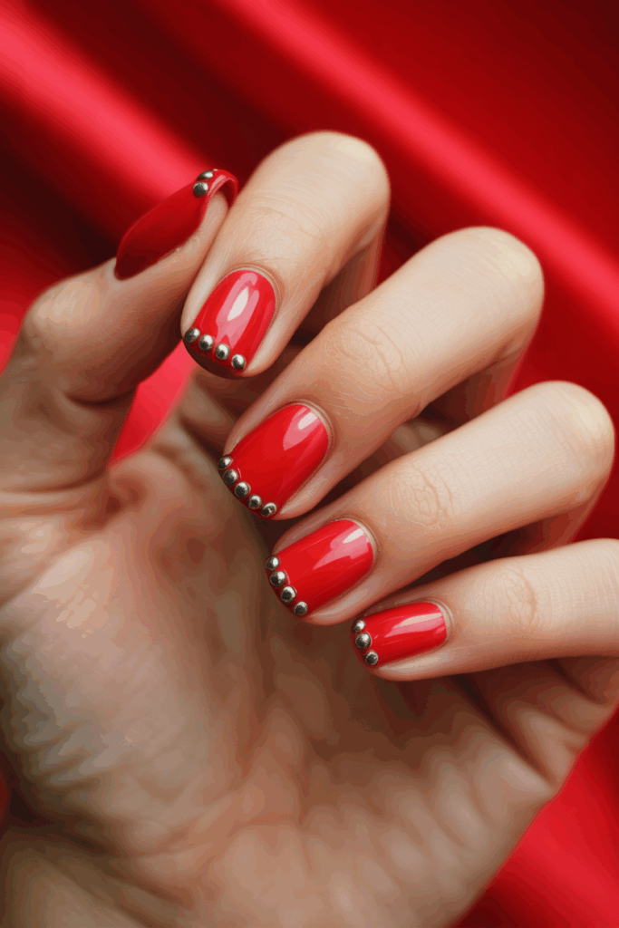 Red nails with silver studs create a sharp and stylish look. The studs add texture and shine to the classic red polish. This design works well for both casual and formal occasions. It gives nails a modern edge without being too flashy.