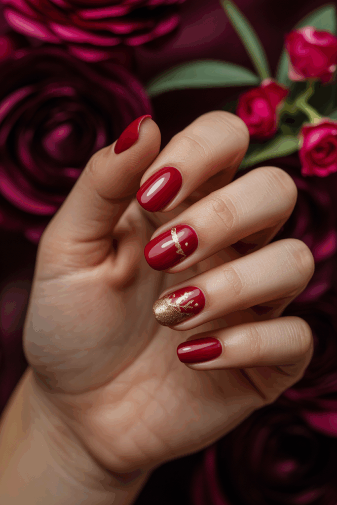 Scarlet nails create a bold, rich base that stands out. Gold accents add a touch of shine without overwhelming the look.